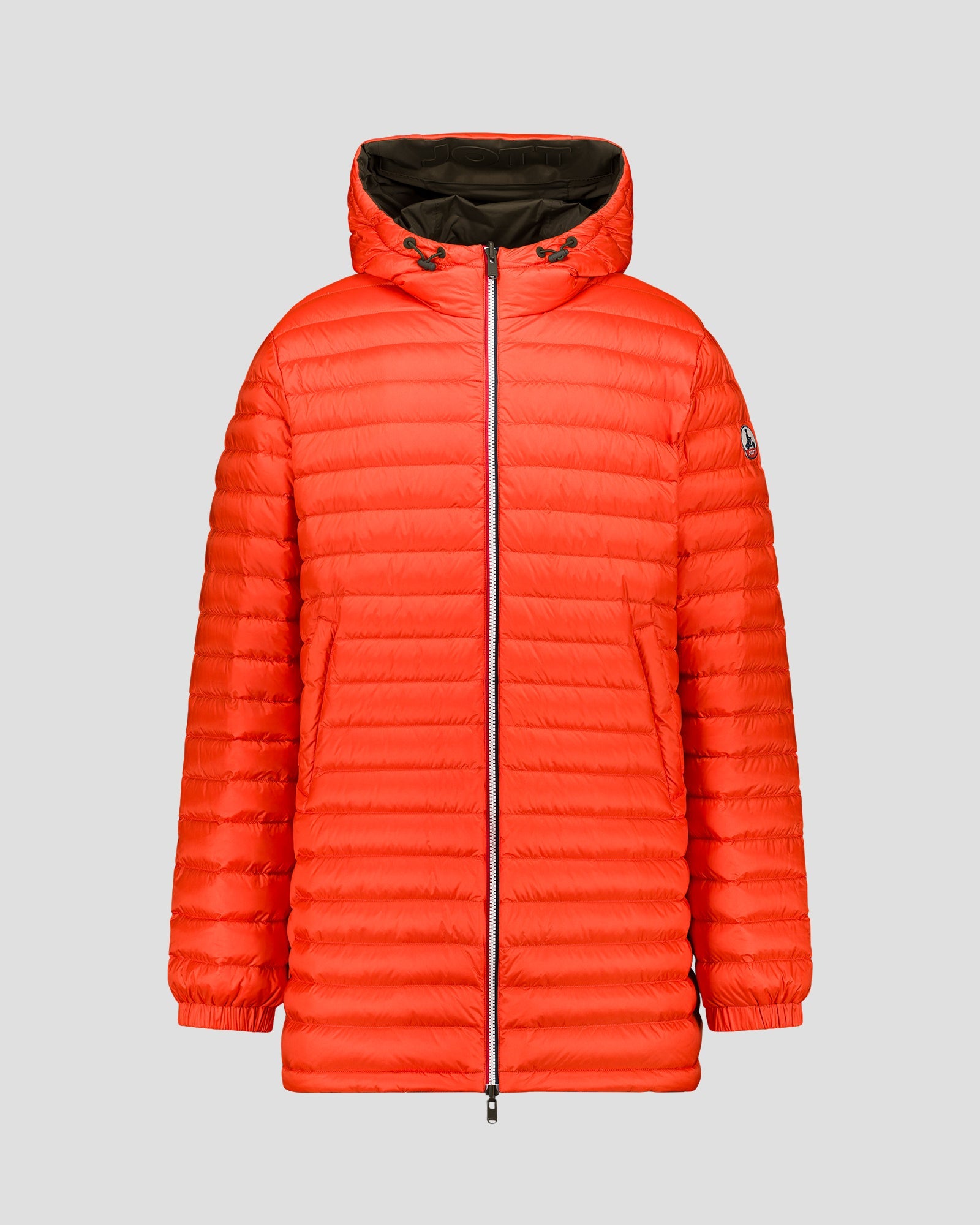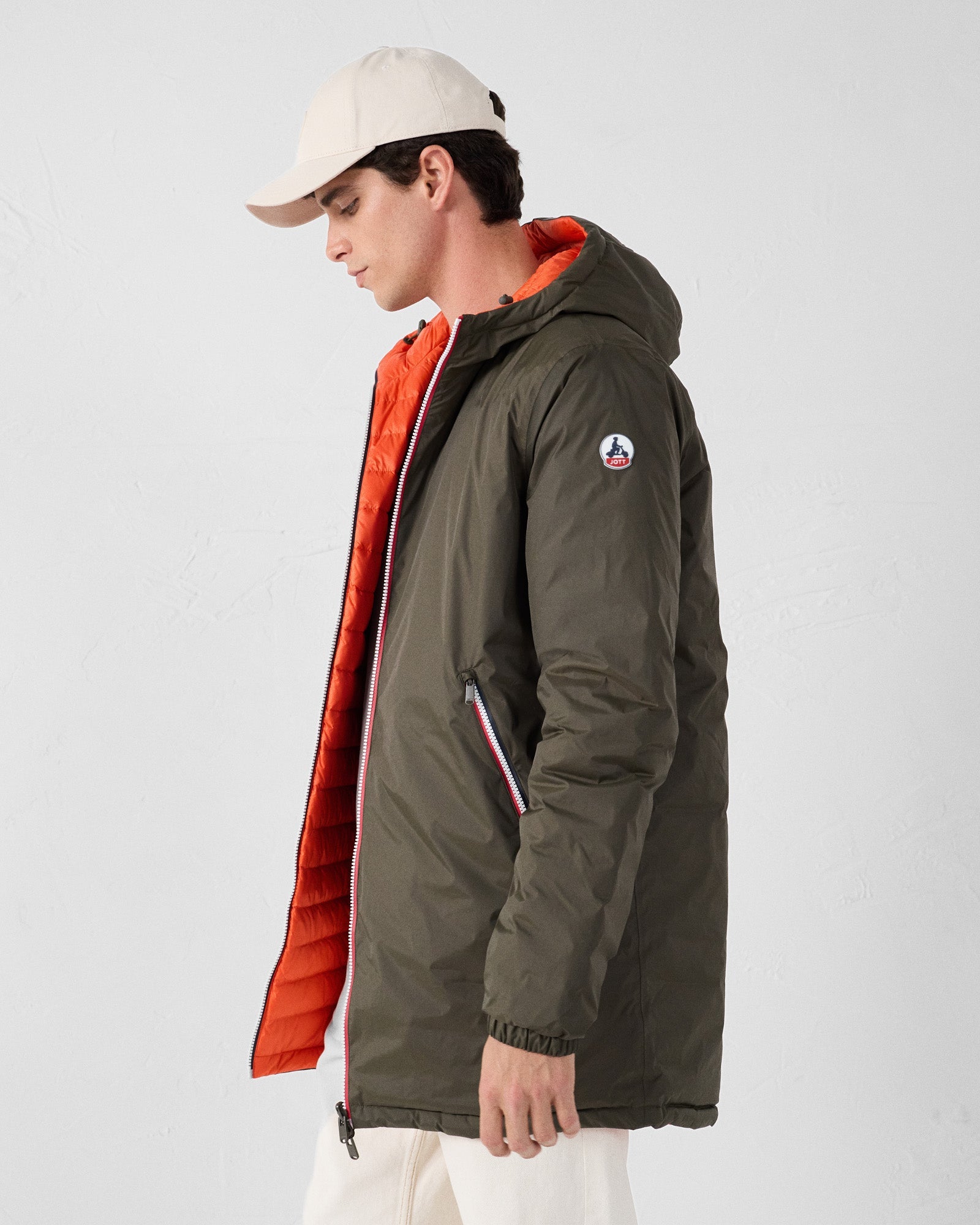 - Face A : tissu imperméable, deux poches latérales zippées, capuche embossée 'JOTT'